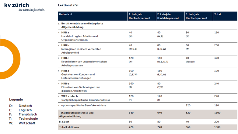 1. Ausbildungsjahr 2. Ausbildungsjahr 3. Ausbildungsjahr Total Berufskenntnisse HKB a 40 40 80 160 Berufskenntnisse HKB b 40 80 80 200 Berufskenntnisse HKB c 120 160 40 320 Berufskenntnisse HKB d 160 160 320 Berufskenntnissse HKB e 160 80 240 Wahlpflichtbereicht 120 120 240 Optionen 120 120 Sport 80 80 40 200 Total Lektionen pro Woche 18 18 9 1800 Total Tage pro Woche 2 2 1 -