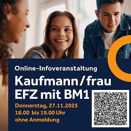 Die Berufsmaturität ist der Königsweg der kaufmännischen Grundbildung! Der Türöffner zu einer Fachhochschule - es ermöglicht dir den prüfungsfreien Zugang zu einem Bachelorstudium. Let’s make it happen!