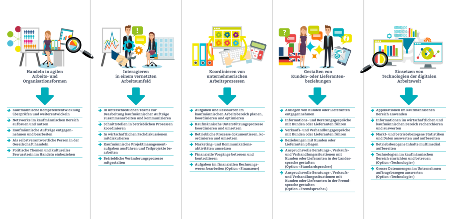 Die (neue) kaufmännische Grundbildung basiert auf sogenannten Handlungskompetenzen. Die Ausbildung dieser Kompetenzen hat zum Ziel, dass Lernende bei Abschluss ihrer Lehre in den festgelegten Bereichen erfolgreich handeln können: «Handlungskompetent ist, wer berufliche Aufgaben und Tätigkeiten eigeninitiativ, zielorientiert, fachgerecht und flexibel ausführt.» (Definition Handlungskompetenzorientierung» des Staatssekretariats für Bildung, Forschung und Innovation (SBFI)).