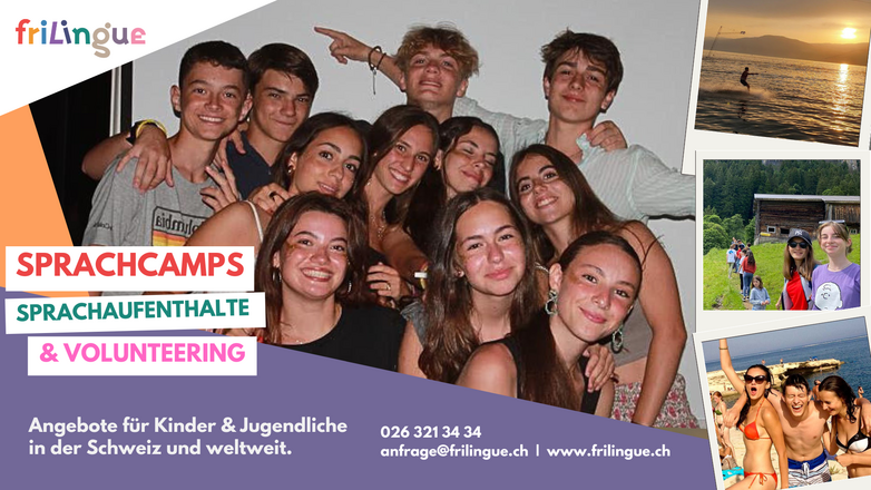 Die friLingue GmbH wurde 2007 von Studenten der Universität Fribourg ins Leben gerufen. Wir organisieren Sprachferien für Jugendliche in der Schweiz und in vielen weiteren Destinationen weltweit. friLingue fördert auf eine völlig entspannte Art die Begeisterung für Sprachen und schlägt Brücken weit über den Röstigraben. Aber uns geht es um mehr als nur Sprachen lernen! Spass, Kommunikation und Begegnung bilden die Basis für unseren und euren Erfolg.