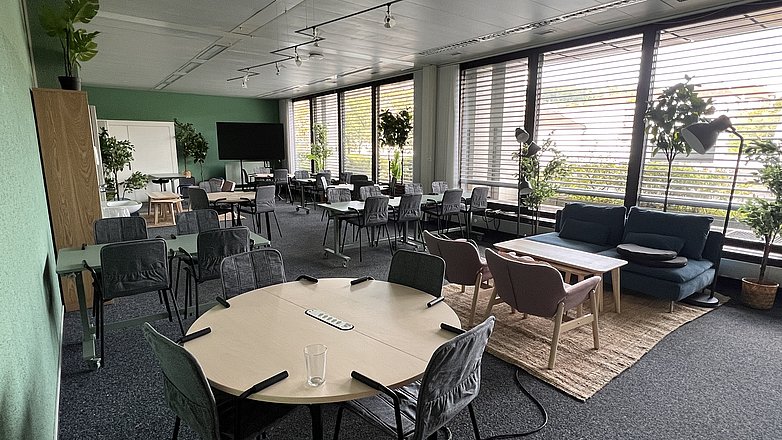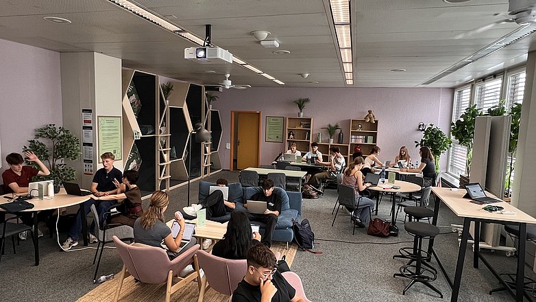 Die Infrastruktur bietet Möglichkeiten für kreatives, kollaboratives und digital unterstütztes Arbeiten. Die Tische haben unterschiedliche Formen und sind teilweise mobil. Damit lassen sie sich einfach neu gruppieren. Mobile Trennwände schaffen flexible Raumstrukturen. Hochtische bieten Möglichkeiten für persönliche Gespräche zwischen Lehrpersonen und Lernenden, während Sofaecken Entspannung und Diskussionsrunden fördern.
