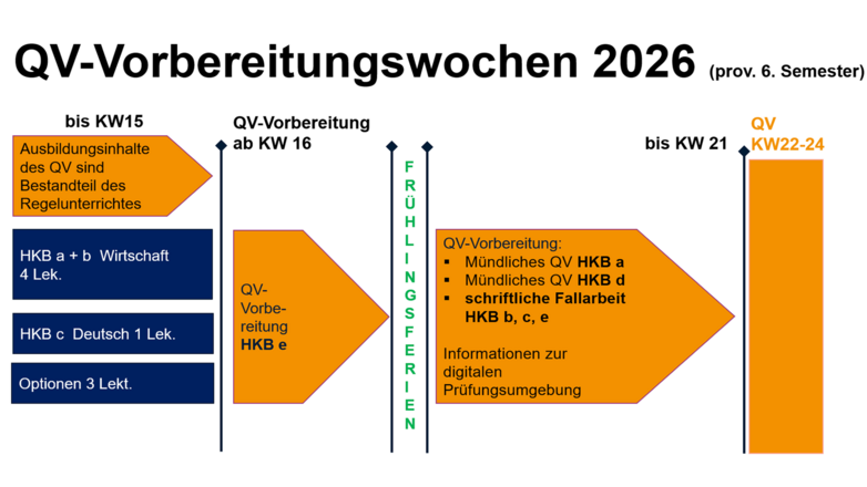 - Während 4 Wochen (vor und nach den Frühlingsferien) finden während der regulären Unterrichtstage fokussiert schriftliche wie mündliche Trainings zum Qualifikationsverfahren statt.